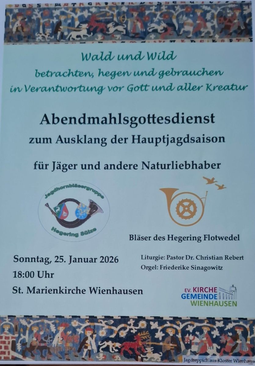 "Wald und Wild betrachten, hegen und gebrauchen in Verantwortung vor Gott und aller Kreatur" lautet das Motto eines Abendmahlsgottesdientes, zu dem die evangelische Kirchengemeinde Wienhausen und die Bläsergruppen der Hegeringe Flotwedel und Sülze alle Jägerinnen und Jäger sowie andere Naturliebhaberinnen und -liebhaber einladen. Er wird am Sonntag, dem 25. 1., um 18 Uhr in der Marienkirche in Wienhausen unter der Leitung von Pastor Dr. Christian Rebert und mit jagdmusikalischer Begleitung anlässlich des Ausklangs der Hauptjagdsaison gefeiert.